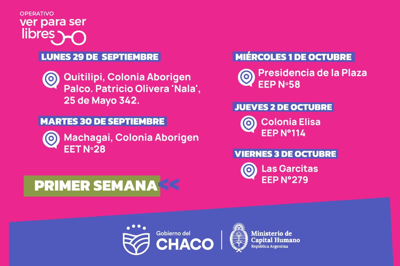 En el mes de septiembre se atenderá en Quitilipi, Machagai y Colonia Aborigen; y en octubre en Presidencia de la Plaza, Colonia Elisa, Las Garcitas, Presidencia Roca, Laguna Limpia, Ciervo Petiso, La Verde, Lapachito y Resistencia.