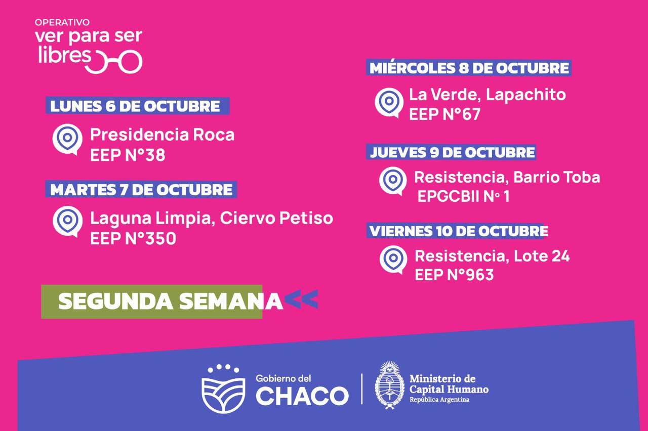El Ministerio de Desarrollo Humano del Chaco, coordinará la tercera etapa del programa nacional Ver Para Ser Libres, en articulación con el Ministerio de Capital Humano de la Nación. La iniciativa está dirigida a niños y niñas de 6 a 12 años de escuelas primarias rurales y periféricas, quienes reciben revisiones oftalmológicas y la entrega inmediata de los anteojos.