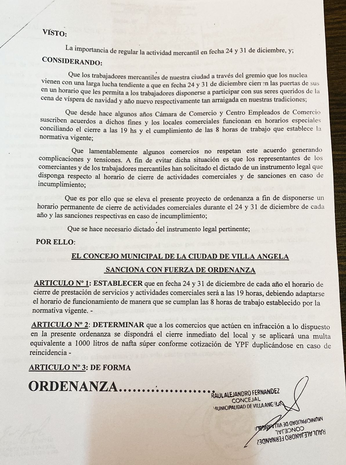 El punto central del conflicto no fue el horario en sí, sino el contenido del proyecto de ordenanza impulsado por un concejal, cuyo artículo 2 establecía sanciones económicas de una magnitud inédita para el sector comercial local. Dicho artículo fijaba una multa equivalente a 1.000 litros de combustible, lo que, a valores actuales, representa más de un millón de pesos por infracción.