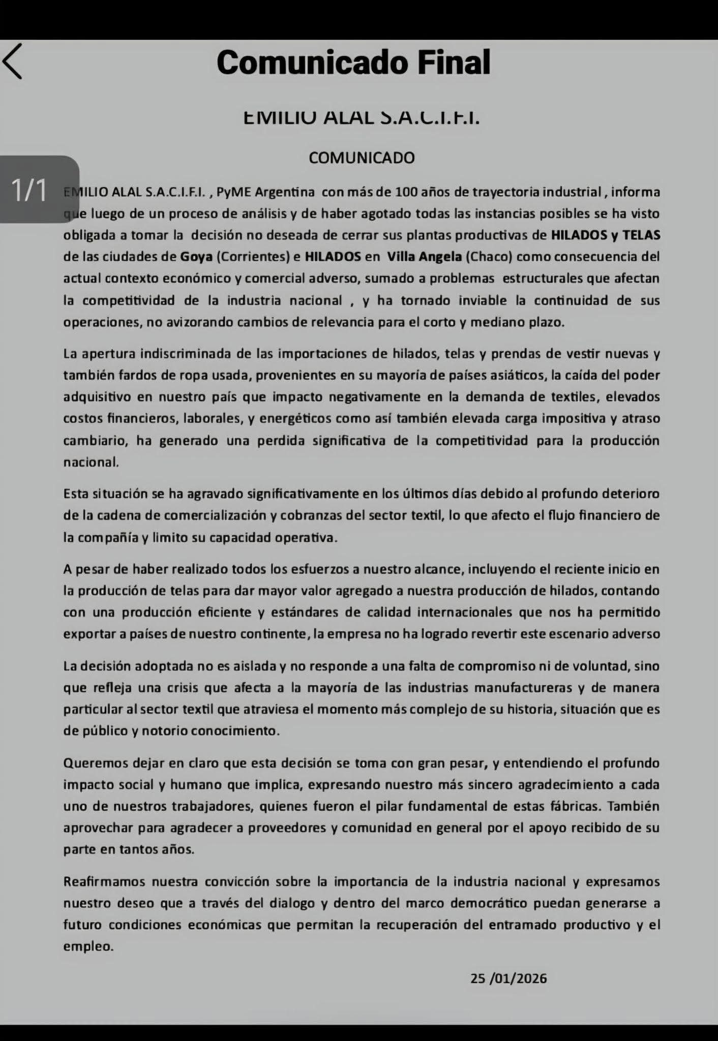 La firma Emilio Alal S.A.C.I.F.I., una PyME argentina con más de 100 años de trayectoria industrial, confirmó este 25 de enero de 2026 el cierre definitivo de sus plantas productivas de hilados y telas en las ciudades de Goya (Corrientes) y Villa Ángela (Chaco).