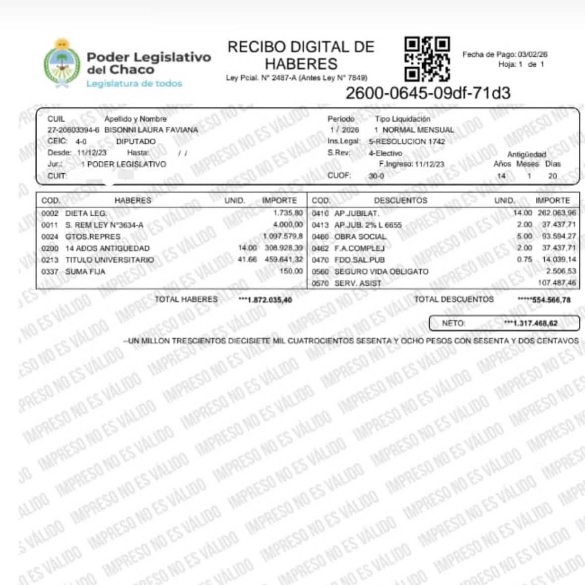 La diputada provincial Laura Bisonni realizó un fuerte descargo público a través de sus redes sociales para aclarar cuánto percibe como legisladora del Chaco, luego de la circulación de versiones que, según expresó, contienen información falsa sobre los ingresos de los diputados provinciales.