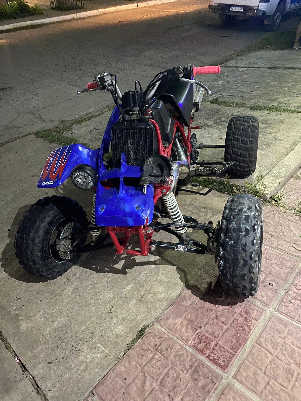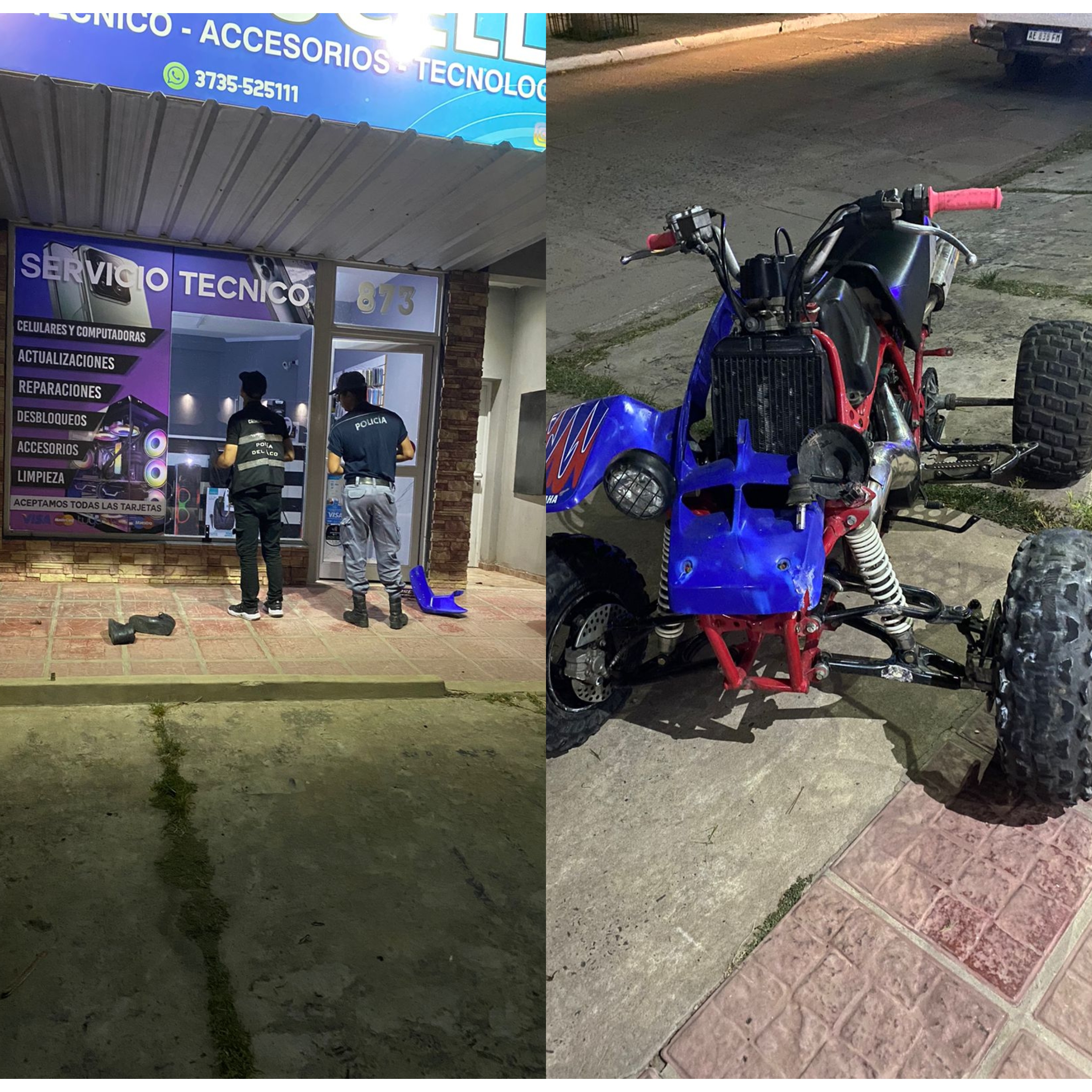 El hecho ocurrió alrededor de las 5:00 horas, cuando por razones que se tratan de establecer, un cuatriciclo marca Yamaha, modelo 350 cc, color azul, que era conducido por C. F. (38), perdió el control e impactó contra el garaje y la vidriera del local comercial “Compucell”.