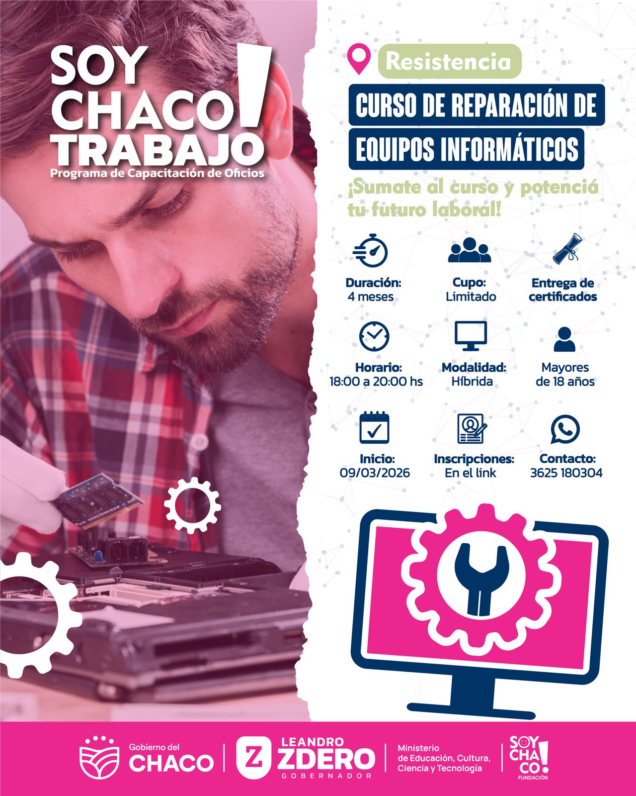 Este martes, la Fundación Soy Chaco anunció la apertura de nuevos cursos de formación en la ciudad de Resistencia. El primero, sobre Fabricación de Muebles en Metal y Madera y el segundo: Reparación de Equipos Informáticos, en el marco del programa Soy Chaco.